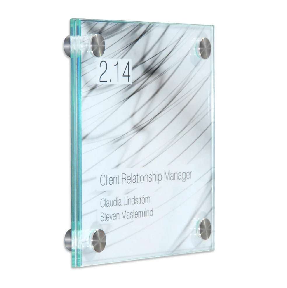 Das ästhetisch sehr hochwertige und äußerst robuste Türschild „INOXO“ brilliert mit der Kombination aus ESG-Glasscheiben und Inox-Abstandhaltern aus Edelstahl.